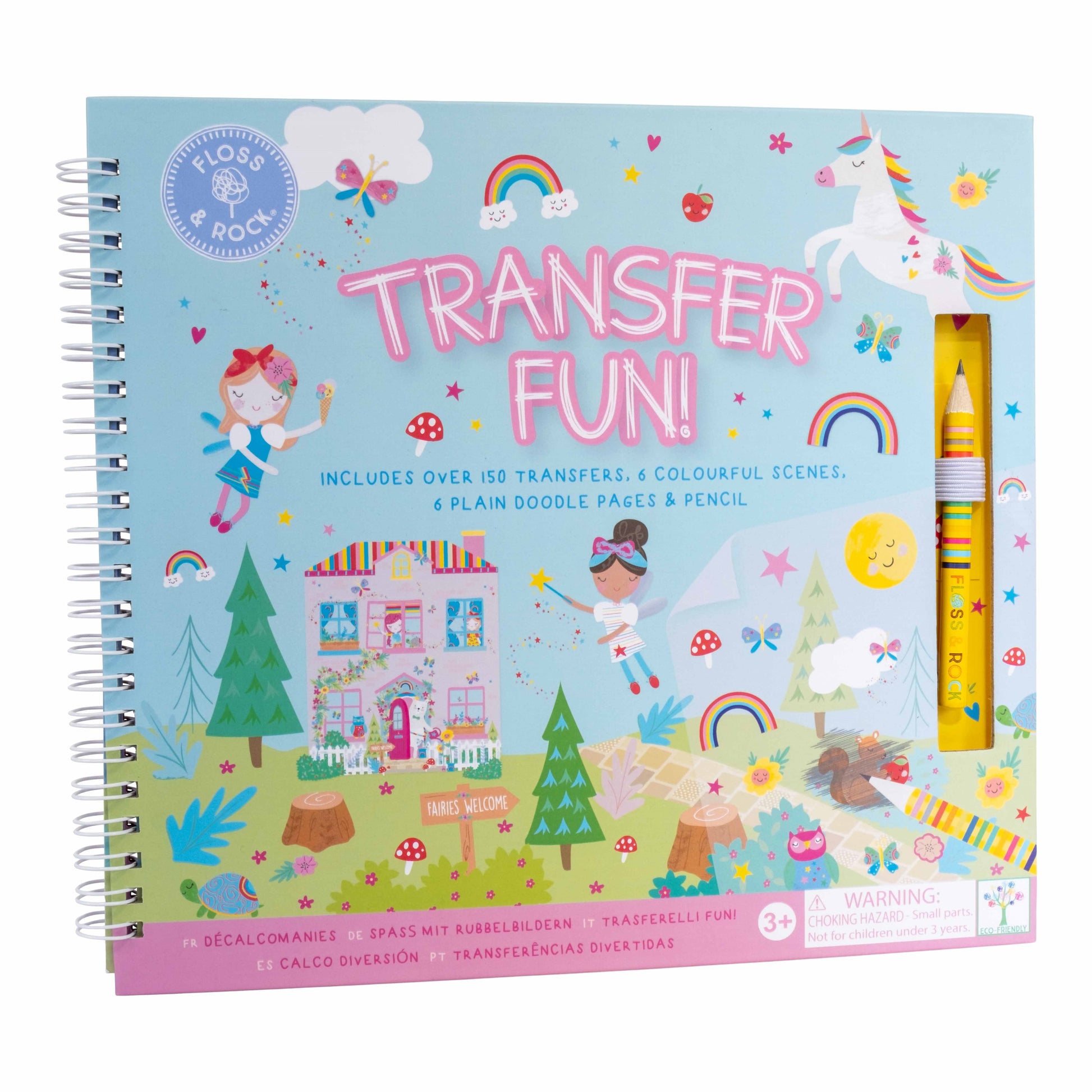 There's so much fun to be had with Transfers! This Rainbow Fairy Transfer Fun comes with over 150 brilliant Rainbow Fairy themed transfers, 6 colourful scenes to place them onto, 6 plain pages for freestyle doodling and a Floss & Rock pencil. Open the spiral bound book to find all your transfers neatly stored in the 'My Transfers' pocket, find your chosen illustration and flick through the pages to find the perfect scene to put them onto. Scratch over the top of the drawing with the pencil provided and lift up the sheet, like MAGIC you'll find them transferred onto the page. Spend many happy hours sparking creativity and making beautiful pictures with fairies, unicorns, llamas and more.